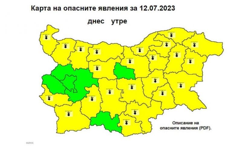 Утре ще е слънчево, около и след обяд - горещо. Ще духа слаб източен вятър. Жълт код за потенциално опасно време е обявен в почти цялата страна, с изключение на София град, София област, Перник, Габрово и Смолян. Максималните температури ще бъдат между 33°, 35 и 38°, в София - около 33°.