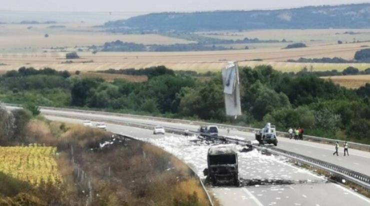 Тирът, който е превозвал пластмасови изделия, се е запалил около петдесетият километър. При инцидента се е запалила и околна растителност, но огънят е потушен.