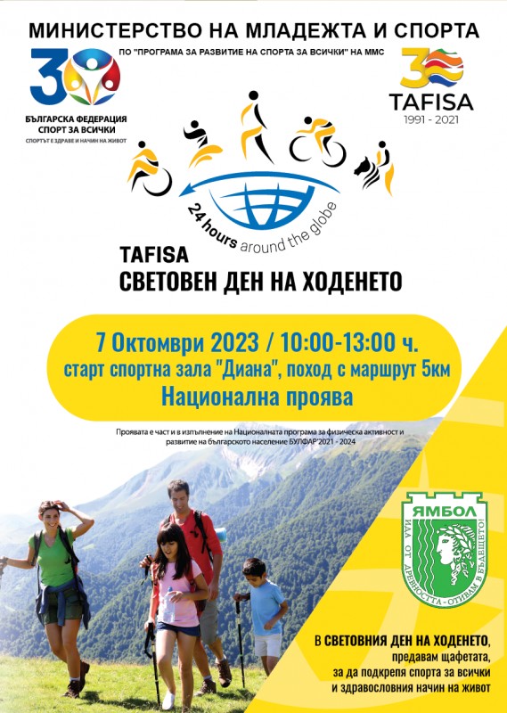 Българска федерация „Спорт за всички“, съвместно с Община Ямбол, организира Национална спортна проява „Световен ден на ходенето 2023“. Събитието ще се проведе на 7 октомври под патронажа на министъра на младежта и спорта Димитър Илиев.