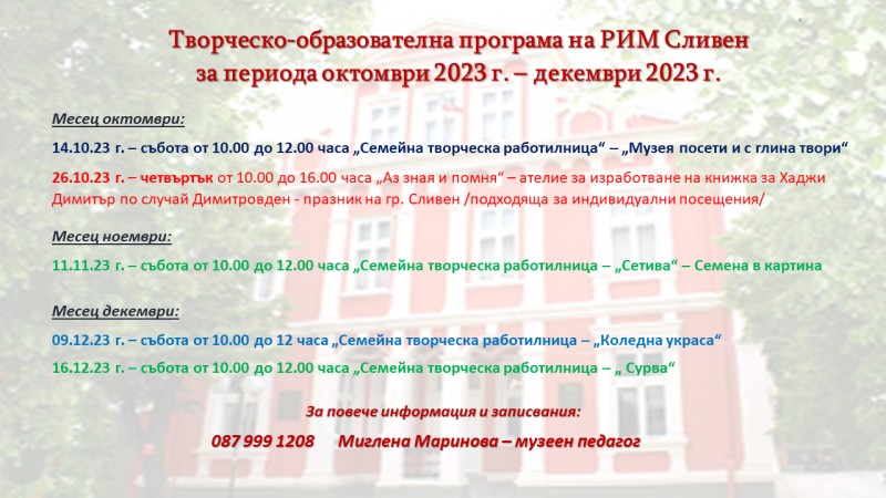 Творческо-образователната програмата на РИМ Сливен за периода октомври 2023 г. – декември 2023 г.