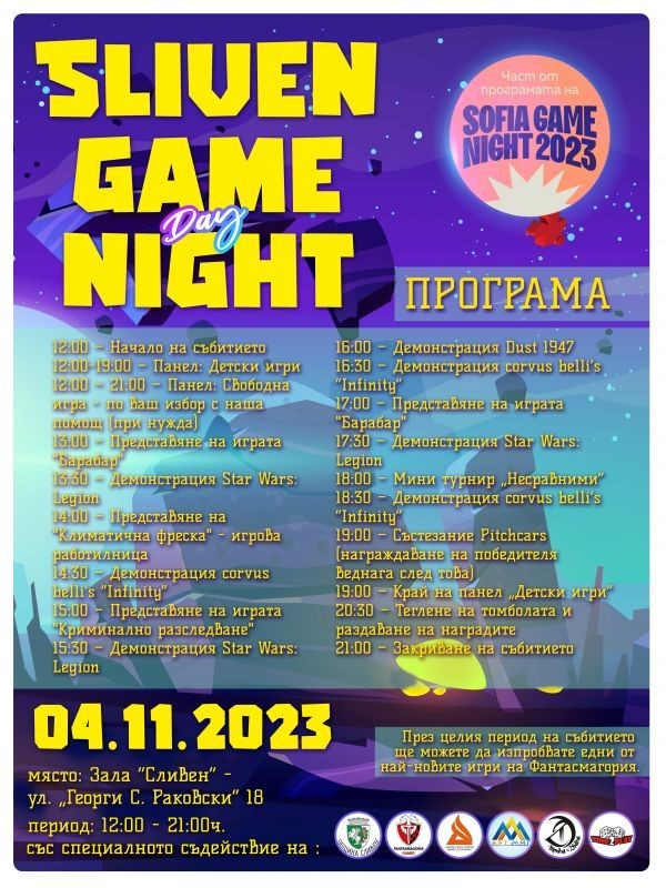 Събитието е част от петото издание на Градския фестивал Sofia Game Night / Нощ на игрите, което се организира в още 8 български града. В Сливен то се реализира с подкрепата на Община Сливен, а входът е свободен и е подходящо за всички възрасти.