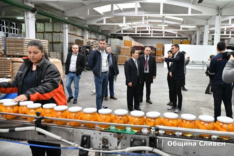 В най-големия български завод за белени праскови делегацията от Китай видя модерен производствен стандарт. Директорът Димитър Алексиев представи базата на „Фрукто“ и асортимента на изделията. Предприятието работи основно за външните пазари, където продукцията има голям успех. В консервите се влагат само пресни плодове и зеленчуци. Гостите от Китай опитаха компоти от белени праскови с бадеми, с аромат на ванилия, от сини сливи с канела, от вишни без костилки. Посланик Дун Сяодзюн заяви, че би било добре сливенските компании да рекламират хубавата си продукция на големи изложения и търговски панаири, включително и в родината му.