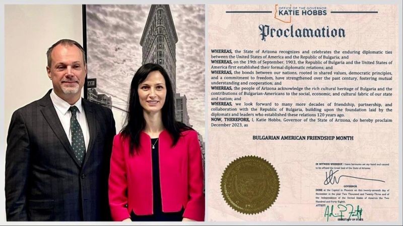 Губернаторът на Аризона, Кейти Хобс, обяви с прокламация месец декември, 2023 г., за Месец на българо-американското приятелство в американския щат.