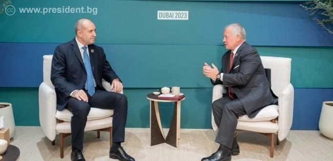 Държавният глава Румен Радев проведе днес среща с краля на Йордания Абдула II в Дубай след откриването на 28-ата сесия на конференцията на страните по рамковата конвенция на ООН по измененията на климата. Двамата обсъдиха последиците от военните действия между Хамас и Държавата Израел.