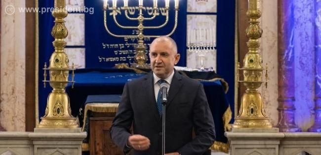Днес много евреи по света ще посрещнат този празник с безпокойство и несигурност, посочи държавният глава и изрази съпричастност към тревогите на еврейската общност за участта на всички невинни жертви на безпрецедентните терористични атаки срещу Държавата Израел, които отнеха живота на много хора, мнозина други бяха отвлечени и съдбата на много от тях остава неизвестна. Президентът Радев изрази надежда за възможно най-скорошно постигане на мир, за създаване на необходимите условия за справедливо и устойчиво решение, което да гарантира сигурност и стабилност в региона на Близкия Изток.