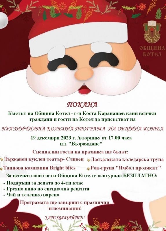 Кметът на Община Котел – г-н Коста Каранашев кани всички котленци и гости на града на VIII-то празнично тържество „Коледа с приятели“, което традиционно се организира по случай наближаващите коледно-новогодишни празници.