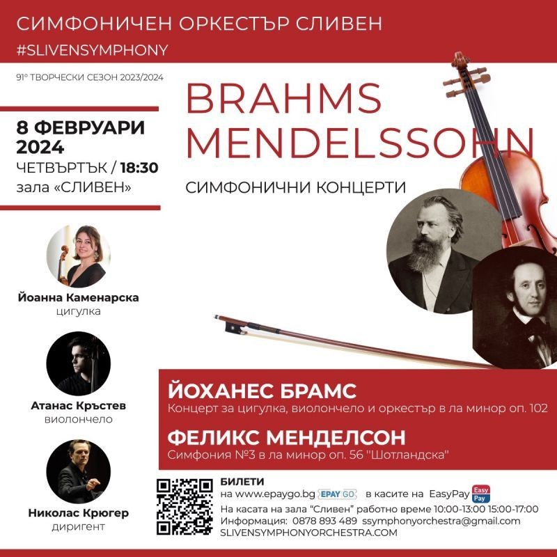 Под палката на френския диригент Николас Крюгер, известен със своите проницателни интерпретации и динамичен стил, публиката ще чуе обичания концерт за цигулка, виолончело и оркестър от Йоханес Брамс и третата симфония от Феликс Менделсон, наречена „Шотландска”.