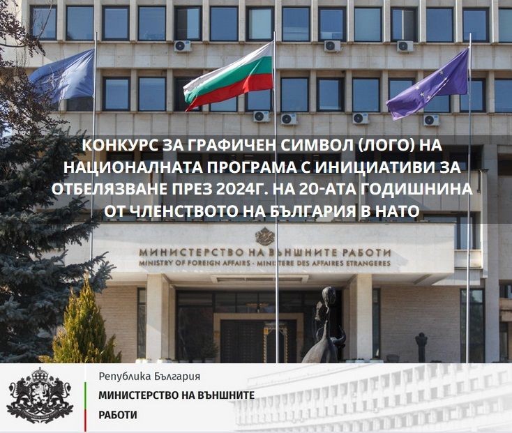 Министерството на външните работи отправя покана за участие в открит конкурс за създаване на графичен символ (лого) на Националната програма с инициативи за отбелязване през 2024 г. на 20-ата годишнина от членството на България в НАТО. В конкурса могат да вземат участие всички български граждани, които са завършили средно или висше образование или са студенти по една от следните специалности – графичен дизайн, комуникационни, художествени и визуални специалности, или маркетинг.