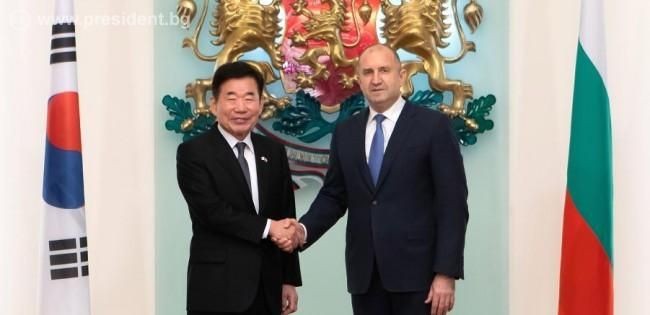 България има амбицията да издигне отношенията си с Република Корея на ниво стратегическо партньорство. Това заяви държавният глава Румен Радев по време на среща в президентската институция с председателя на Националното събрание на Република Корея Ким Джин-пьо, който е на официално посещение у нас. В рамките на разговора бяха обсъдени перспективите за задълбочаване на двустранното сътрудничество в областта на икономиката, енергетиката, отбраната, автомобилната индустрия, високите технологии, научните изследвания и изследването на космоса, образованието и културата.