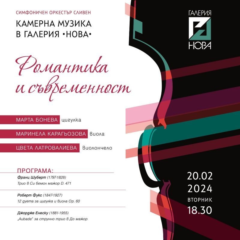 Първото събитие „Романтика и съвременност”, ще се състои във вторник, 20 Февруари, от 18:30 ч. в Галерия „Нова”. Струнно трио в състав Марта Бонева (цигулка), Маринела Карагьозова (виола) и Цвета Латровалиева (виолончело), ще представи на гостите специално подбрана вълнуваща програма.
