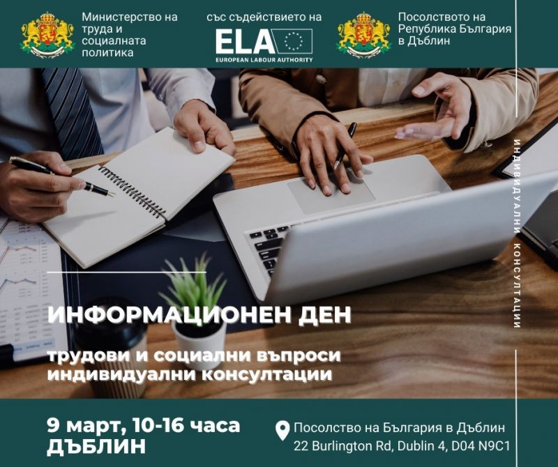 Информационен ден за български граждани по въпроси, свързани с трудови и социални права, организира Службата по трудови и социални въпроси на Министерството на труда и социалната политика (МТСП) към Посолството на България в Ирландия със съдействието на Европейския орган по труда. Събитието ще се проведе на 9 март (събота) от 10:00 до 16:00 в сградата на Посолството на България в Дъблин на адрес: 22 Burlington Rd, Dublin 4, D04 N9C1.