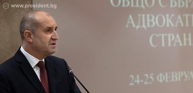 „В тази сложна и противоречива среда адвокатите често се явяват последната бариера пред беззаконието и гарант за справедливостта. Неслучайно българската адвокатура има своето особено място, отредено й в Конституцията, която ясно показва, че тя следва да бъде свободна, независима и самоуправляваща се“, заяви Румен Радев пред делегатите от Общото събрание.