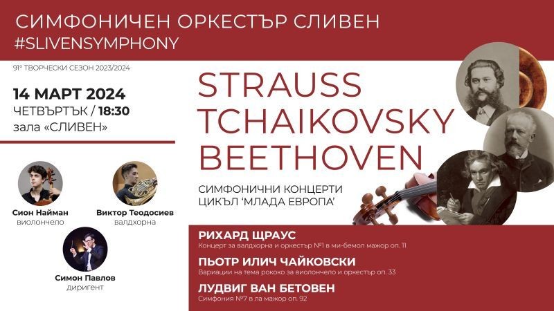 Музикалните ентусиасти и ценители на изкуството ще се насладят на още една незабравима вечер, когато Симфоничен оркестър - Сливен ще представи поредното събитие от своя цикъл „Млада Европа“. То ще се състои на 14 март, от 18:30 ч. в зала „Сливен“. Този концерт обещава омагьосващо пътешествие в царството на класическата музика, с участието на трима изключително талантливи млади артисти - Виктор Теодосиев /валдхорна/, Сион Найман /виолончело/, и Симон Павлов /диригент/.