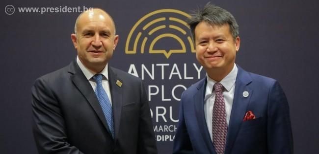 Защитата на интелектуалната собственост и подобряването на механизмите, по които компаниите в България получават достъп до финансиране и за защита на своите идеи и продуктите и технологиите, които разработват, обсъдиха на среща в Анталия президентът Румен Радев и генералният директор на Световната организация по интелектуална собственост (СОИС) Дарен Танг. СОИС е една от специализираните междуправителствени организации на ООН и в нея членуват 193 държави от цял свят.