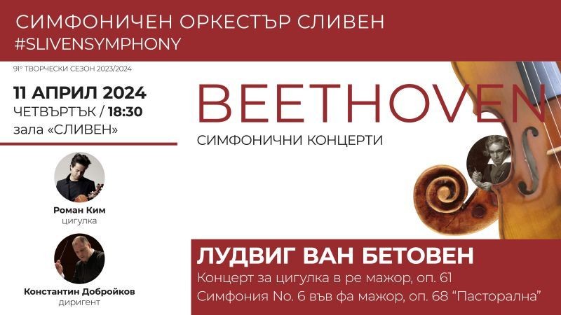 На 11 април, четвъртък, от 18:30 часа, зала "Сливен" ще бъде домакин на концерт, изпълнен с величието на музиката на Бетовен. Под ръководството на диригента Константин Добройков, Сливенският симфоничен оркестър ще изпълни Концерт за цигулка и оркестър в ре мажор оп.61 от Лудвиг ван Бетовен, със солист гостуващия за втори път в града Роман Ким. Като второ произведение в програмата ще бъде изпълнена Симфония No.6 оп.68, известна още като „Пасторална“.