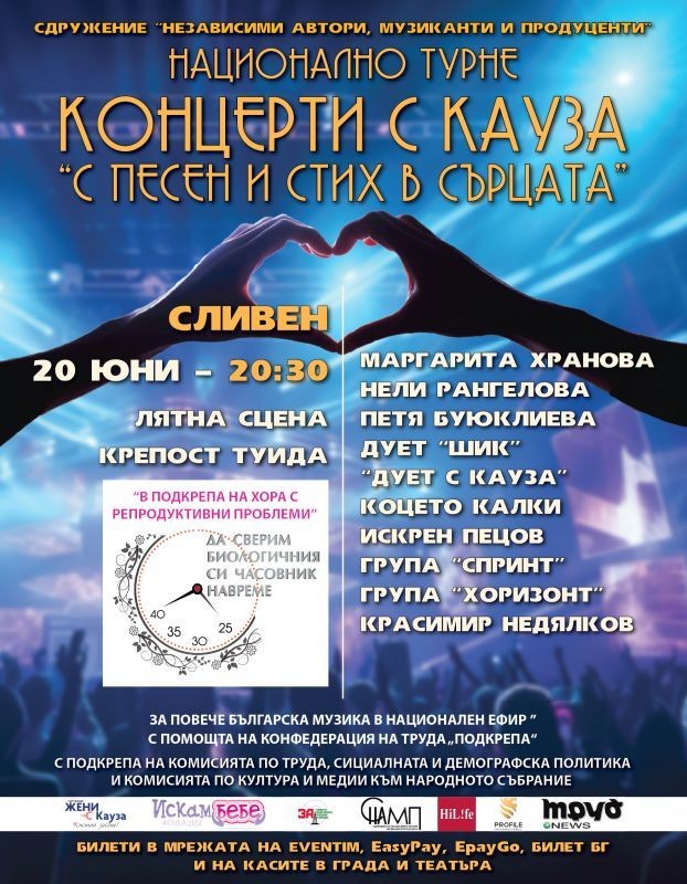 На 20 юни /четвъртък/ от 20:30 ч. град Сливен ще бъде домакин на концерт с кауза "С песен и стих в сърцата", част от националното турне, което включва популярни български изпълнители, подкрепящи различни каузи и вярващи в тяхната мисия. Събитието ще се състои на лятната сцена в крепост Туида, като публиката ще се наслади на изпълненията на известни имена от музикалната сцена като Маргарита Хранова, Нели Рангелова, Петя Буюклиева, Милена Славова, Дует „ШИК“, Дует WEIL, Коцето Калки и Мартина Табакова, Искрен Пецов, Невена Пейкова, „Дует с кауза“ - Галя Георгиева и Атанас Лазаров, Вокално трио „DEJA VU“, Група „Спринт“ и Група „Хоризонт“. Концертът ще бъде съпроводен от оркестър „София“, състоящ се от Асен Драгнев, Николай Томов, Ивайло Терзиев и Толя Георгиев.