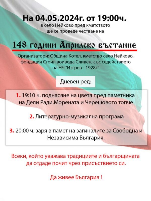 На 4 май /събота/, на площада пред сградата на кметството в село Нейково ще бъде отбелязана 148-годишнината от Априлското въстание. Патриотичната програма ще започне в 19:00 часа и ще включва следните събития: