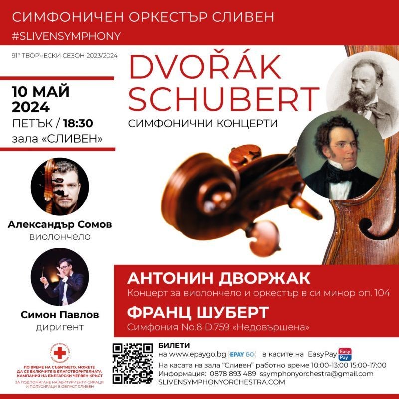 На 10 май в зала "Сливен" ще бъде представена вдъхновяваща комбинация от две забележителни музикални произведения. Концертът за виолончело от Антонин Дворжак и Симфония №8 „Недовършена“ от Франц Шуберт ще бъдат изпълнени в рамките на 91-ия творчески сезон на Симфоничния оркестър Сливен и фестивала „Майски дни на културата“ „Сливенски огньове“ 2024 г.