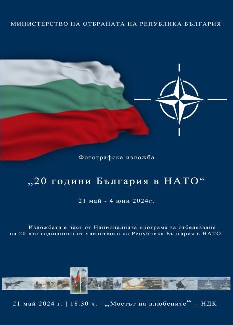 Фотографска изложба, озаглавена „20 години България в НАТО“, ще бъде открита от министъра на отбраната Атанас Запрянов на 21 май (вторник) от 18:30 ч. на моста до Националния дворец на културата („Мостът на влюбените“). Изложбата е посветена на 20-годишнината от присъединяването на страната ни към Организацията на Северноатлантическия договор (НАТО) и включва снимки, направени от военнослужещи и цивилни служители на Министерство на отбраната, структурите, подчинени на министъра на отбраната, и видовете въоръжени сили.