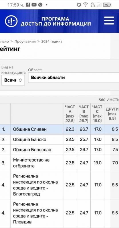 Община Сливен отново е на първо място по общ рейтинг на активна прозрачност сред всички 560 институции в България за 2024 г.