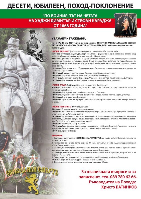 Това лято за десети път родолюбци от гр. Сливен ще тръгнат по стъпките на четата на Хаджи Димитър и Стефан Караджа. Целта на този поход-поклонение е да се почете паметта на воеводите и техните съратници, загинали за свободата на България. На 16 юли, от площад „Хаджи Димитър“ в Сливен, група хора ще се отправят с организиран транспорт, първо спирайки край село Вардим на брега на Дунава, където четниците влизат в България през 1868 г.