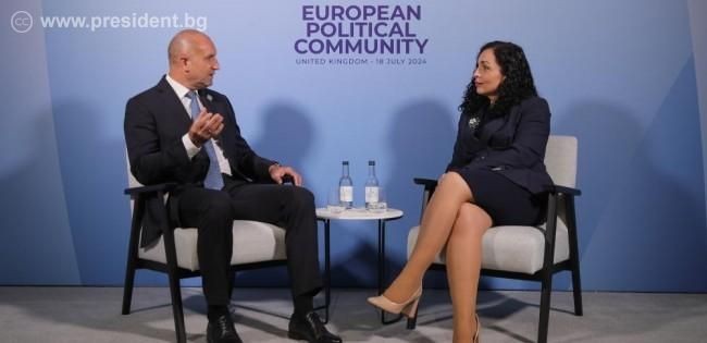 Президентът Румен Радев заяви, че ускоряването на процеса на интеграция на Косово в международните структури и европейската и евроатлантическата общност ще бъде положителен знак за целия регион. Това изказване беше направено по време на срещата му с президента на Косово Вьоса Османи преди началото на срещата на върха на Европейската политическа общност в двореца „Бленъм“ край Оксфорд, Великобритания. Двамата лидери подчертаха отличния политически диалог като ключов фактор за развитието на отношенията между България и Косово, съобщиха от българското Президентство.