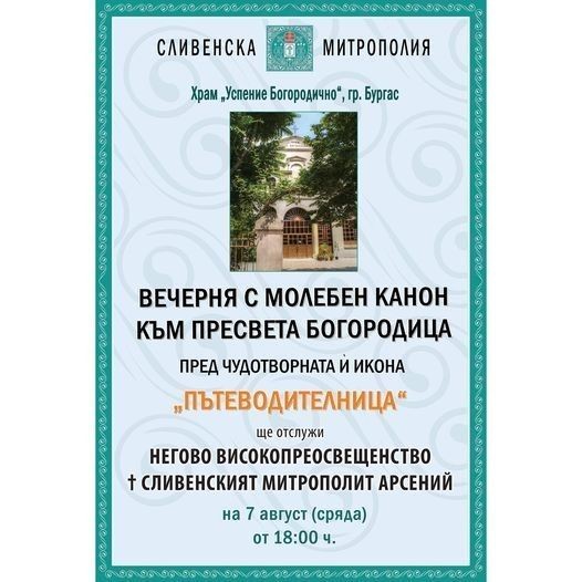 В храм “Успение Богородично”, гр. Бургас, Негово Високопреосвещенство ✞ Сливенският Митрополит Арсений, ще отслужи Вечерня с Молебен канон към Пресвета Богородица. Събитието ще се състои на 7 август от 18:00 часа, съобщават от Сливенска Митрополия.