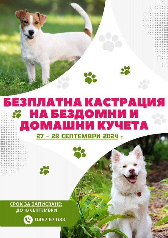 Ако желаете да кастрирате кучето си безплатно, можете да заявите желанието си на телефон: 0457 57 033 до 10 септември.