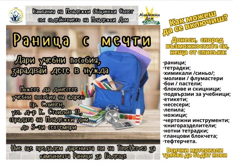Младежки общински съвет и Младежки дом в Сливен започнаха кампания за събиране на училищни пособия за деца със специални образователни нужди. Кампанията има за цел да осигури пълен комплект от училищни материали като раници, тетрадки, химикалки, блокчета за рисуване и други, които ще бъдат раздадени на тези деца. Кампанията ще продължи до 5-ти септември и всеки, който иска да участва, може да донесе необходимите материали в сградата на Младежкия дом на адрес: гр. Сливен, ул. д-р Константин Стоилов 12. Младежите от Общинския съвет ще сортират и опаковат материалите в напълно заредени раници, които след това ще бъдат дарени на нуждаещите се деца.