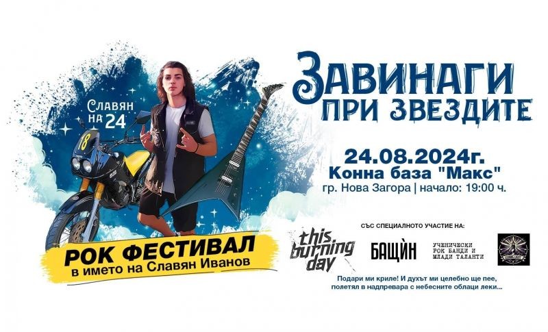 Само няколко дни след рождения ден на Славян Иванов, който трябваше да празнува 24-ия си рожден ден тази година, на 24 август от 19:00 часа в Конна база „Макс“ в град Нова Загора ще се състои рок фестивалът в негова памет „Завинаги при звездите“. Това събитие се провежда за трета поредна година по инициатива на Иван Иванов, баща на новозагорския талант от класа по китара към ОШИ „Илия Аврамов“. Община Нова Загора подкрепя събитието.