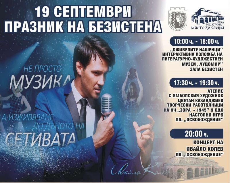 Културно-информационният център „Безистен“ ще празнува своята девета годишнина на 19 септември с разнообразна програма от събития. Акцентът ще бъде концертът на певеца Ивайло Колев, известен с участието си в първия риалити формат в България „Star Academy“. Концертът, озаглавен „Save The Last Dance“, ще се състои на открита сцена „Безистен“ от 20:00 часа, съобщават от Община Ямбол.