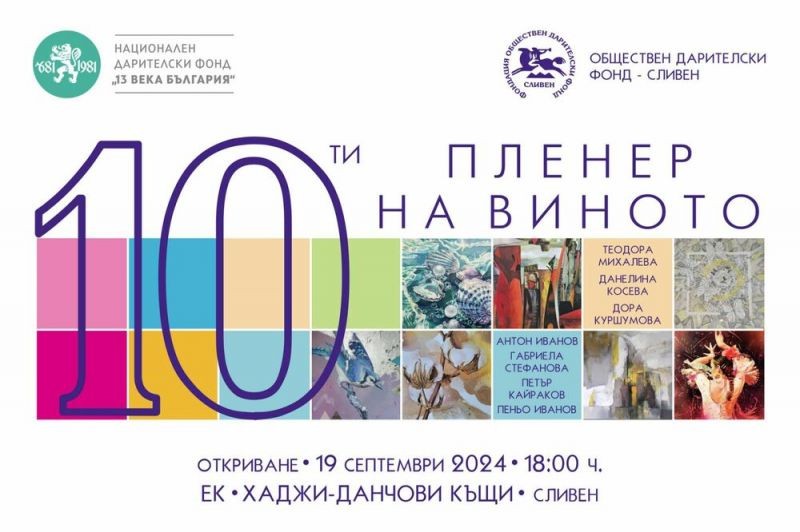 Седем художници от Сливен представят седемнадесет творби на Десетия пленер на виното, организиран от Фондация "Обществен дарителски фонд-Сливен" съвместно с Национален дарителски фонд "13 Века България", съобщава БТА. Картините са изложени в Етнографския комплекс "Хаджи Данчови къщи", а откриването на изложбата се състоя вчера.