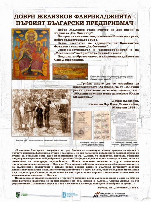 Добри Желязков, с две ключови предприемачески начинания от 1834 и 1836-1837 година, оказва значително влияние върху развитието на Сливен, региона и страната. Изложбата, състояща се от десет винилни платна, представя исторически факти за живота и дейността на Желязков в контекста на социално-икономическите и технологичните условия на текстилното производство през ХIХ век.