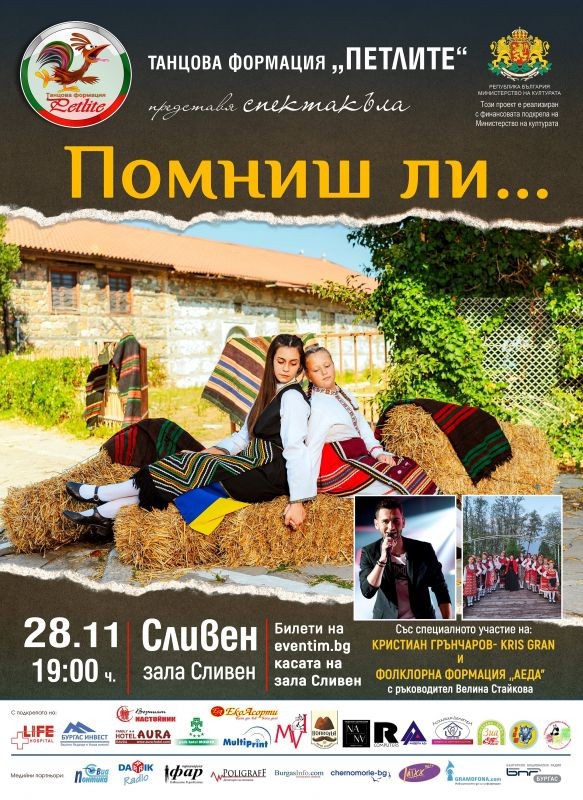 На 28 ноември в зала "Сливен" ще се играе спектакълът "Помниш ли...?" на танцова формация "Петлите". Създадена през 2022 г., пиесата е представена в градове като Бургас, Малко Търново и Поморие.