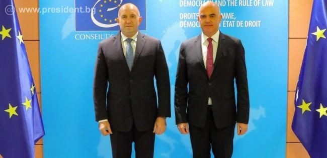 Президентът Румен Радев подчерта значимостта на партньорството между България и Съвета на Европа в области като върховенството на правото и защитата на човешките права, които са основополагащи за демократичното общество. Това стана по време на посещението му в Страсбург по покана на генералния секретар на Съвета на Европа, Ален Берсе. Радев проведе срещи с Берсе, комисаря по правата на човека Майкъл О’Флаерти и посети Европейския съд по правата на човека.
