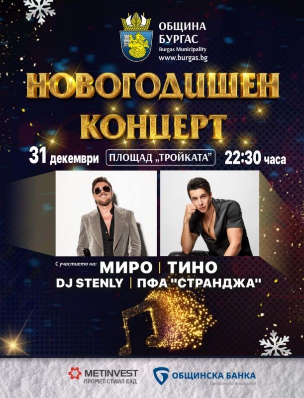 След коледните празници, празничното настроение в Бургас ще продължи с голям новогодишен купон на 31 декември, започващ в 22:30 ч. на площад „Тройката“. Община Бургас отново подготвя празничен концерт, който ще зарадва жителите и гостите на града.