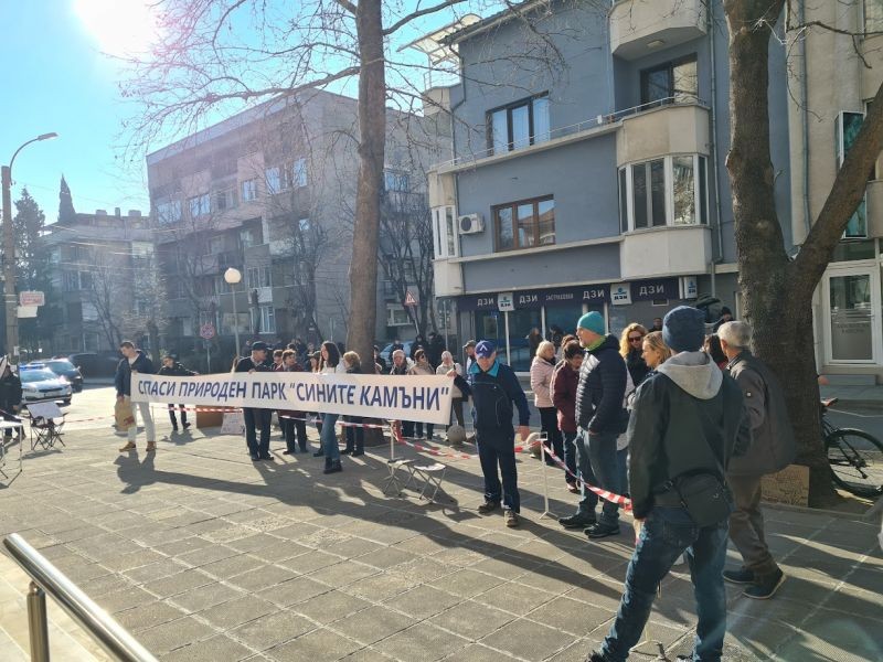 Протестиращите носеха плакати с надписи като „Спаси Природен парк „Сините камъни“ и „Искаме природа, не искаме бетон!“. Те символично оградиха тротоара пред сградата на администрацията, за да подчертаят абсурдността на поставянето на нови граници върху държавна собственост. Представители на протестиращите участваха в заседанието на комисията, но искането им за прекратяване на заседанието бе отхвърлено. В крайна сметка, предложението за изваждане на имота беше прието със седем гласа „за“ и два „против“, а решението ще бъде изпратено на министъра на околната среда и водите, съобщи БТА.