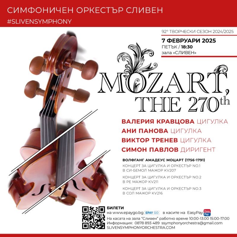 На 7 февруари 2025 г. от 18:30 ч. в Зала "Сливен" Симфоничен оркестър Сливен ще представи пореден концерт от цикъла "Млада Европа". Събитието ще бъде посветено на музиката на Волфганг Амадеус Моцарт и ще постави началото на поредица от изяви по случай 270-годишнината от рождението на композитора.