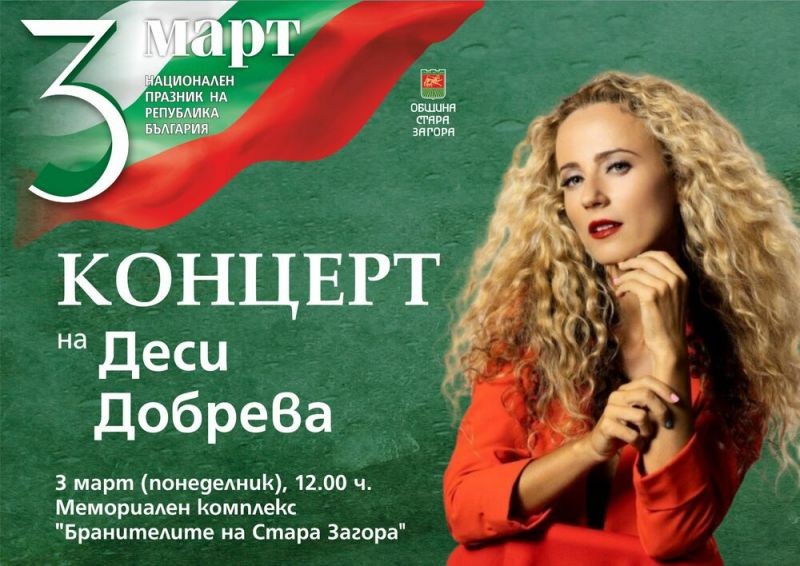 Жителите и гостите на Стара Загора ще имат възможността да чуят на живо певицата Деси Добрева, която ще отправи специален музикален поздрав по повод Националния празник 3 март, съобщава БТА.