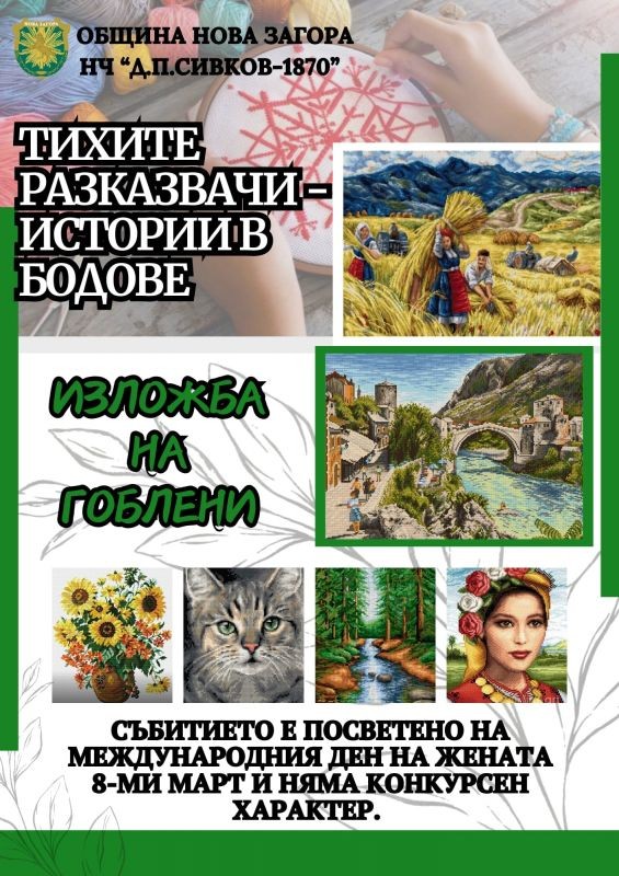 Община Нова Загора и Народно читалище „Д. П. Сивков-1870” канят любителите на гобленарското изкуство да участват в изложбата „Тихите разказвачи – истории в бодове“, посветена на Международния ден на жената – 8 март. Изложбата няма конкурсен характер и цели да представи красотата на ръчно изработените гоблени.