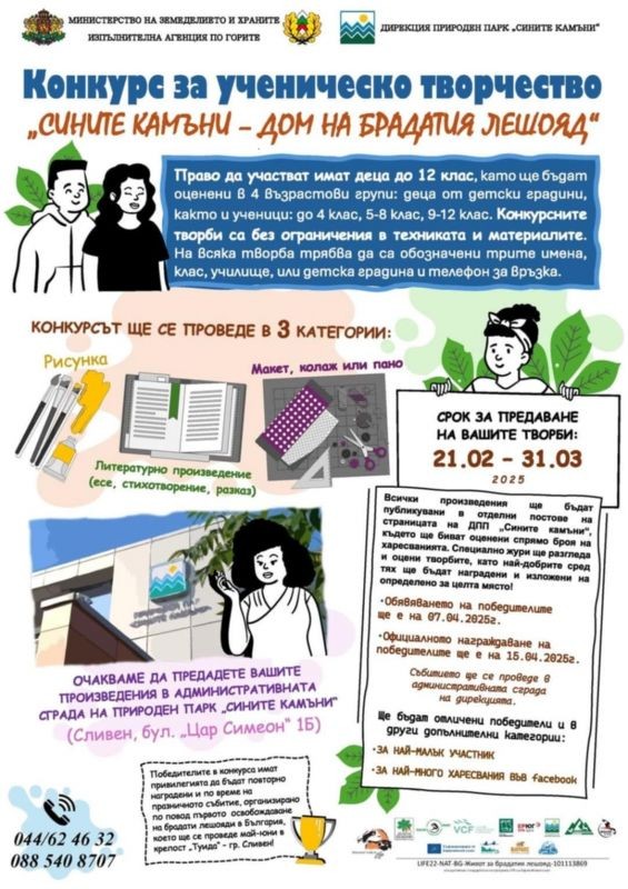 В Сливен стартира ученическият конкурс „Сините камъни – дом на брадатия лешояд“, който ще се проведе в три категории: рисунка, литературно произведение (есе, стихотворение, разказ) и макет, колаж или пано.