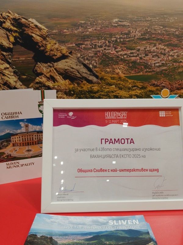 Община Сливен бе отличена с грамота за най-интерактивен щанд на международното туристическо изложение „Ваканция&СПА Експо 2025“. Наградата е признание за иновативния подход на общината и културните институции, които представиха туристическите обекти на града чрез нови технологии и визуални ефекти.