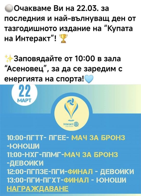 Финалите на ученическия волейболен турнир „Купата на Интеракт“ в Сливен ще се проведат на 22 март (събота) от 10:00 ч. в Спортен комплекс „Асеновец“. Турнирът, организиран от Интеракт клуб Сливен за трета поредна година, включва шест мъжки и шест женски отбора от различни училища в областта.
