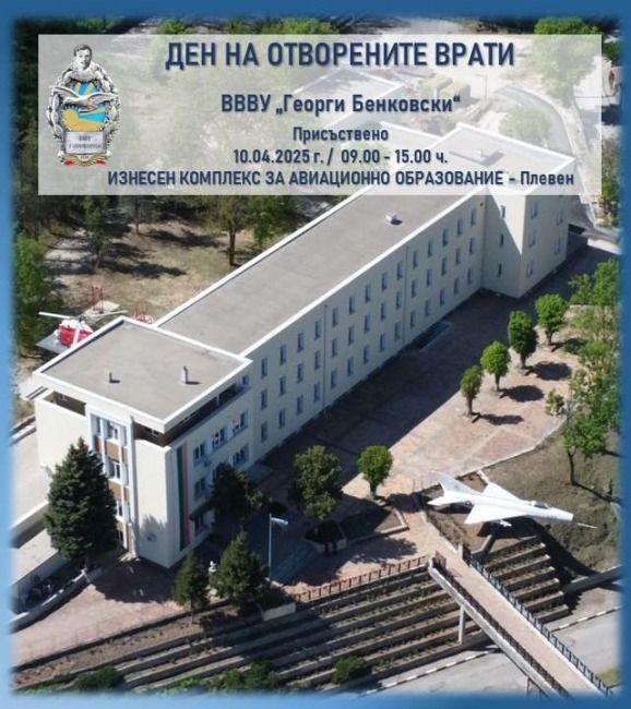 На 10 април 2025 г. Висшето военновъздушно училище „Г. Бенковски“ ще проведе Ден на отворените врати в своя авиационен учебен комплекс в Плевен. Събитието ще се проведе от 9:00 до 15:00 часа и ще даде възможност на посетителите да се запознаят с условията на обучение, да разговарят с курсанти и студенти, както и да получат подробна информация за бакалавърските и магистърските програми, съобщават от Министерство на отбраната.