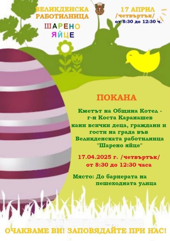 Кметът на Община Котел Коста Каранашев отправя покана към всички деца, жители и гости на града да се включат в традиционната великденска работилница „Шарено яйце“, която ще се проведе на 17 април – Велики четвъртък, от 8:30 до 12:30 часа до бариерата на пешеходната улица в Котел.
