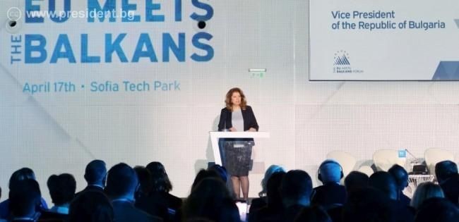 Вицепрезидентът критикува непоследователността на европейската политика към Западните Балкани и припомни, че България възобнови темата за разширяване на ЕС по време на своето председателство през 2018 г. Според нея, без държавите от региона Европа няма как да бъде глобален лидер, а замразяването на процеса на разширяване би довело до повече нестабилност и външни влияния.