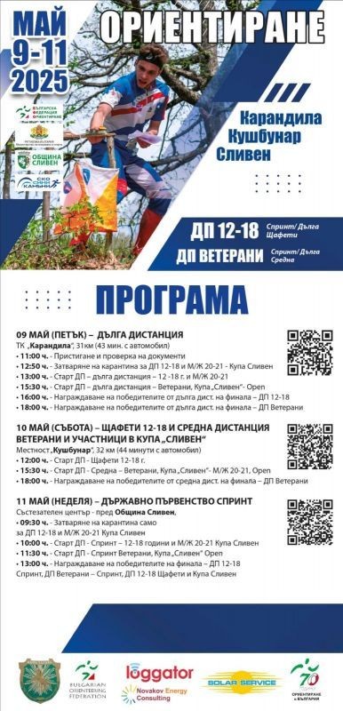 От 9 до 11 май 2025 г. Сливен ще бъде домакин на Държавното първенство по ориентиране за възрастови групи 12–18 години и ветерани, както и на съпътстващата го Купа „Сливен“. Очаква се участие на около 700 състезатели от цялата страна, които ще се съревновават в дисциплините дълга дистанция, щафета, средна дистанция и спринт. Надпреварите ще се проведат в различни местности около града, включително “Карандила”, “Кушбунар” и централната градска част.