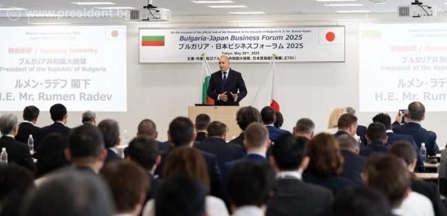 Президентът Румен Радев подчерта значението на японските инвестиции в България по време на бизнес форум в Токио, в който участваха представители на близо 150 японски компании. Той посочи, че японският модел за правене на бизнес е пример за устойчивост, иновации и дългосрочно планиране, който България може да следва за постигане на по-високи икономически резултати.