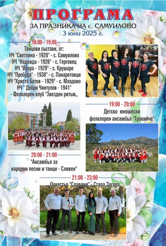 В събитието ще участват самодейци от различни села в общината. На централната сцена в Самуилово ще се изявят танцови и певчески състави към местните читалища – от Самуилово, Гергевец, Крушаре, Панаретовци, Младово, както и Фолклорен клуб „Звезден ритъм“ към читалище „Добри Чинтулов“ от Сливен.