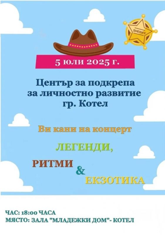 Центърът за подкрепа за личностно развитие – Котел организира летен концерт под мотото „Легенди, ритми, екзотика“. Събитието ще се състои на 5 юли (събота) от 18:00 ч. в залата на Младежкия дом в Котел.